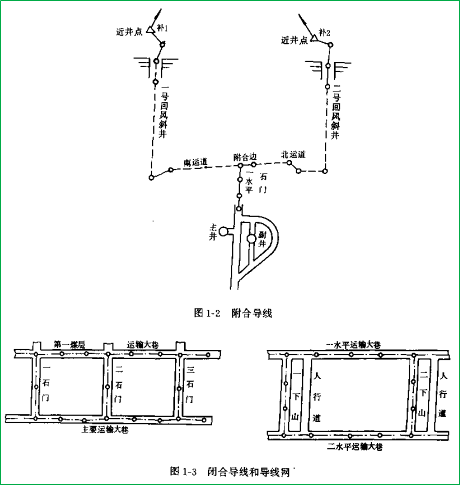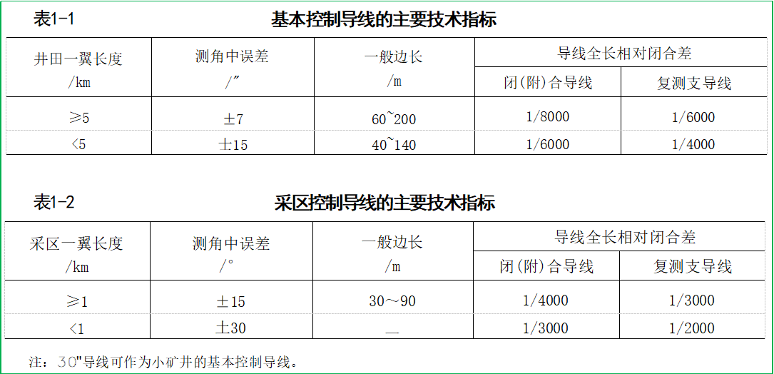 井下导线的布设,按照“高级控制低级”的原则进行。我国《煤矿测量规程》规定,井下平面控制分为基本控制(表1-1)和采区控制(表1-2)两类(具体技术指标参见现行规范),这两类又都应敷设成闭(附)合导线或复测支导线。