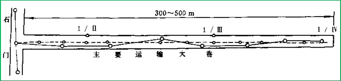基本控制导线按照测角精度分为±7"和±15"两级, 一般从井底车场的起始边开始,沿矿井主要巷道(井底车场,水平大巷,集中上、下山等)敷设,通常每隔1.5~2.0 km 应加测陀螺定向边,以提供检核和方位平差条件。 采区控制导线也按测角精度分为±15”和±30”两级,沿采区上、下山、中间巷道或片盘运输巷道以及其他次要巷道敷设。 二、井下导线的发展与形式 井下导线往往不是一次全面布网,面是随井下巷道掘进而逐步敷设。如下图所示: 当由石门处拉门开始掘进主要运输大巷时,随巷道掘进而先敷设低等级的±15”或±30"导线(如上图中虚线所示),用以控制巷道中线的标定和及时填绘矿图,随巷道掘进每30~100m 延 长 一次。当巷道掘进到300~500m 时,再敷设±7”级或±15"级基本控制导线,用来检查前面已敷设的低等级采区控制导线是否正确,所以其起始边(点)和最终边(点)一般应与低等级控制导线边(点)相重合。 当巷道继续向前掘进时,以基本控制导线所测设的最终边为基础,向前敷设低等级控制导线和给中线。当巷道又掘进300~500m 时,再延长基本控制导线。这样不断分段重复,直到形成闭(附)合导线和导线网,如图1-3和图1-4所示。